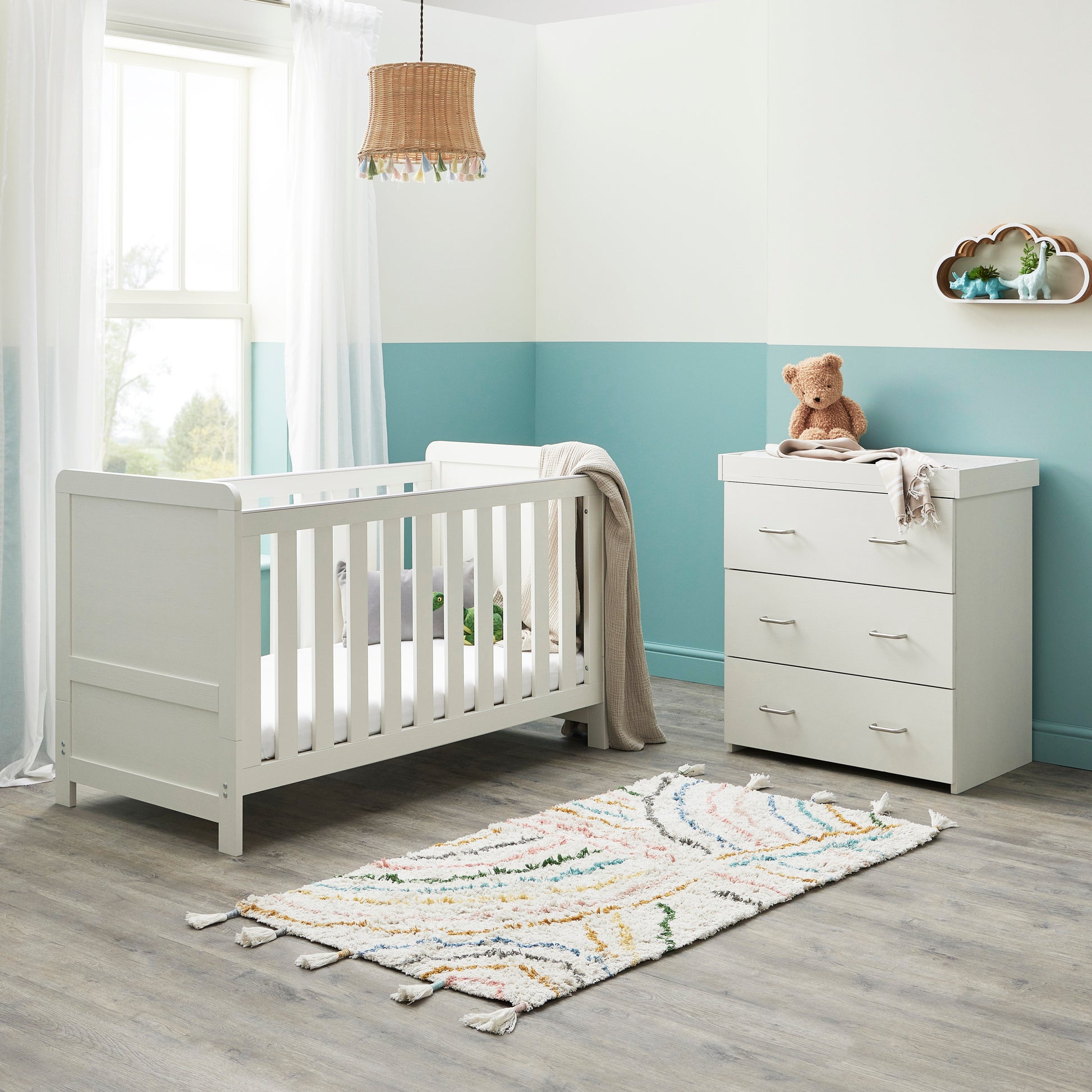 The Caro nursery collection is the ideal starting point for your nursery decor thanks to its timeless style and woodgrain finish. A stylish cot bed and versatile dresser are included in our Caro 2-piece nursery set.