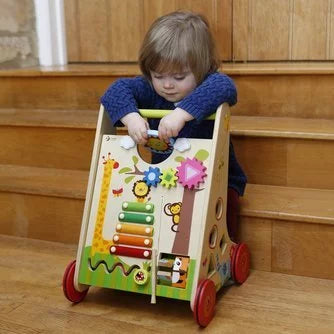 This learning wooden baby walker has a sturdy base and a unique design that makes standing and pushing a breeze. Includes sorting blocks, a simple puzzle, a xylophone, a clock and cogs. It encourages first steps and helps build confidence in walking, easing your child’s frustration by distraction.