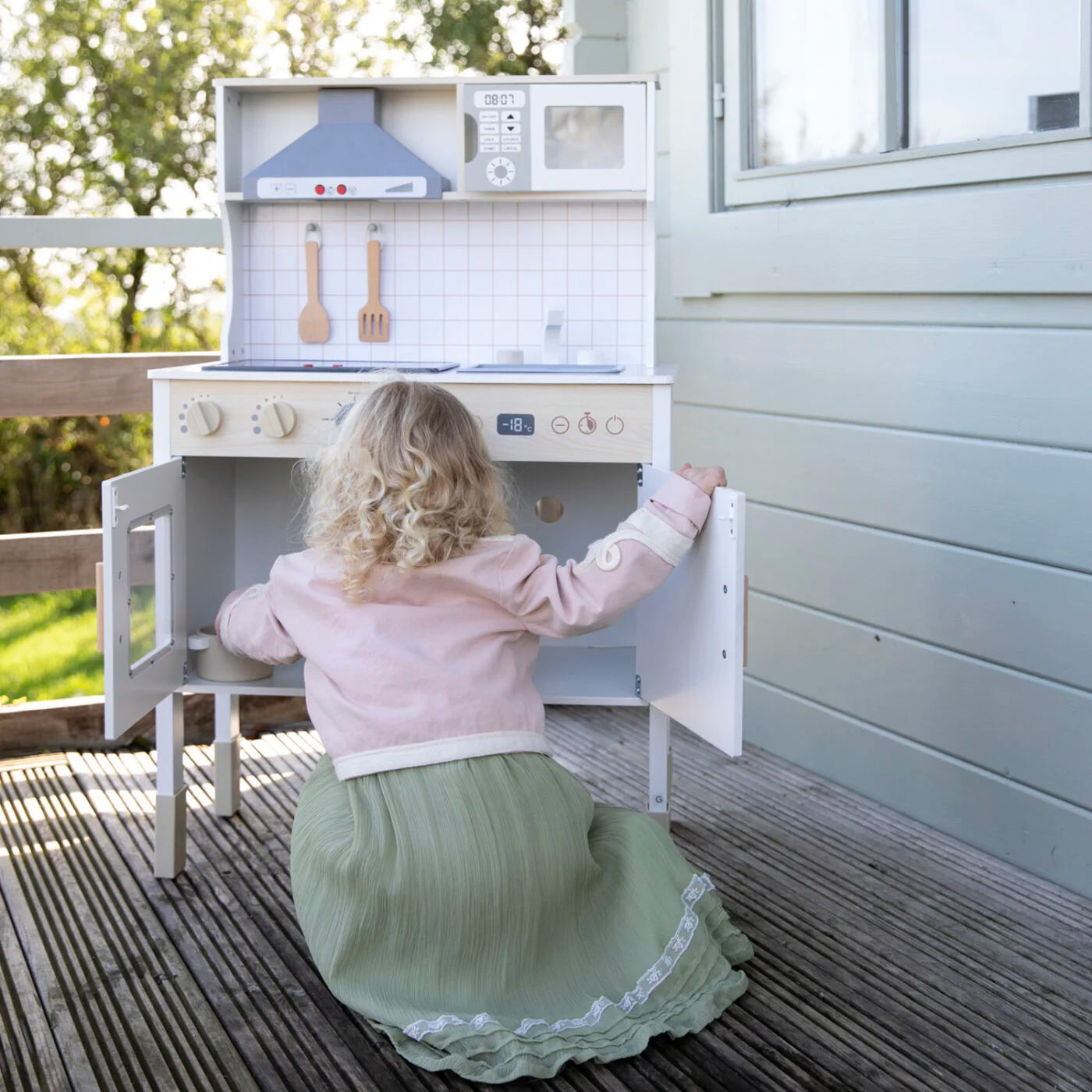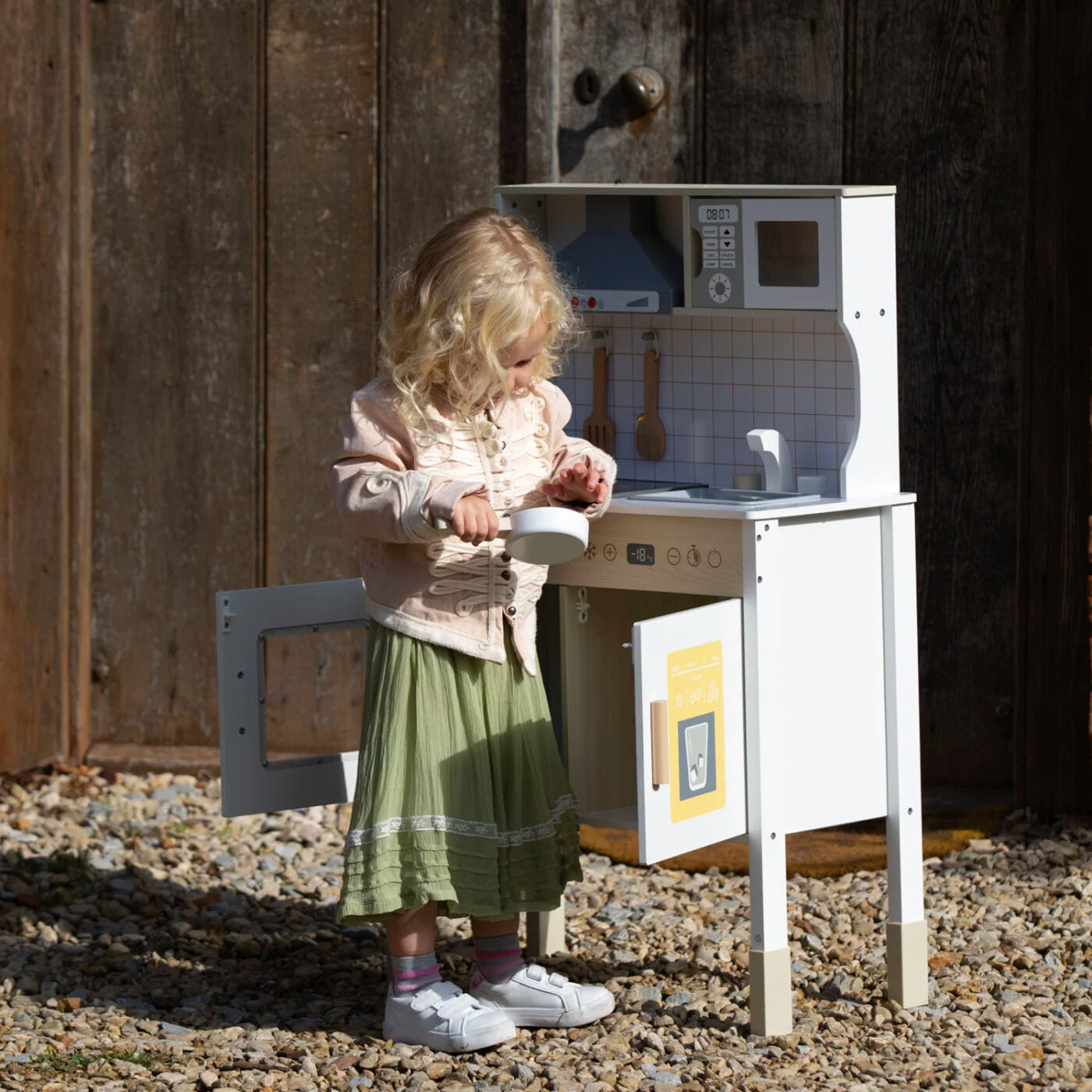 This beautiful, modern kitchen is the perfect way for your little ones to be introduced to the kitchen. It has all the essential components of a modern kitchen to help provide hours of enjoyment. It includes a microwave, oven, sink and cooking accessories. It also has hobs that light up and sound effects of the cooker hood and cooking ingredients to really encourage your child’s imagination. Children can have the full experience of becoming a chef with this wooden toy.
