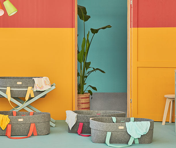 Crafted with the softest yet robust wool felt and adorned with chic colored cotton handles, this groovy basket is a Mokee classic - recognised as the coolest, hippest and comfiest nest on the baby scene.
