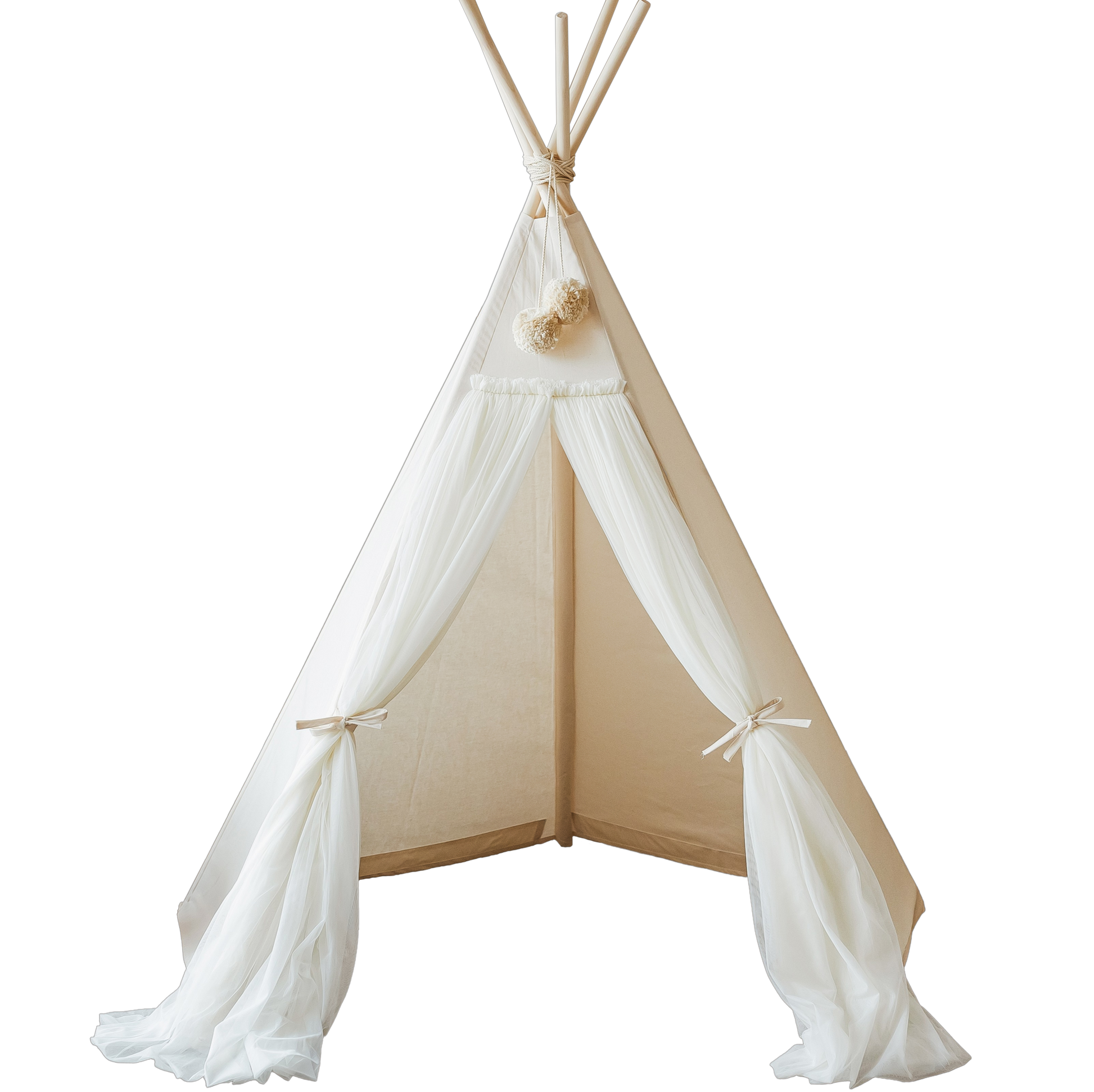 GREAT QUALITY. The children's teepee is made from unbleached natural 100% OEKO-TEX certified cotton and natural wood poles, featuring royal tulle (100% Polyester) entrance.