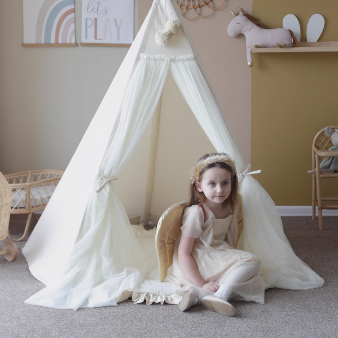 FAIRY TEEPEE. Treat your little girl like a princess with our adorable princess fairy teepee. This lovely teepee features lots of tulle, pom poms on top which makes it an ideal play place for your little one. This teepee is also an ideal photo prop for birthdays, Christmas, and other festive occasions.