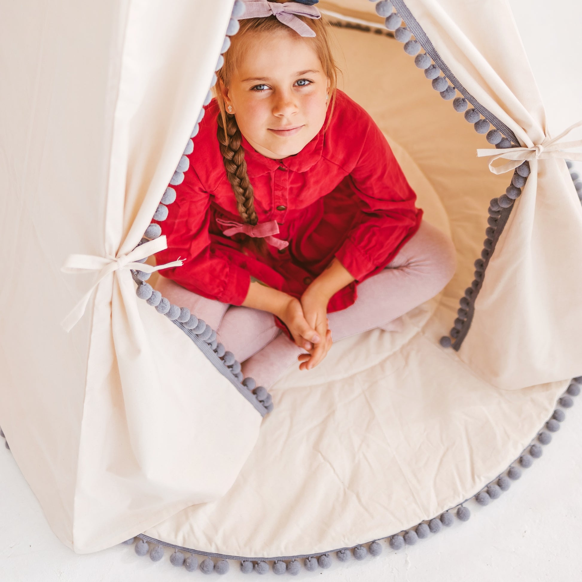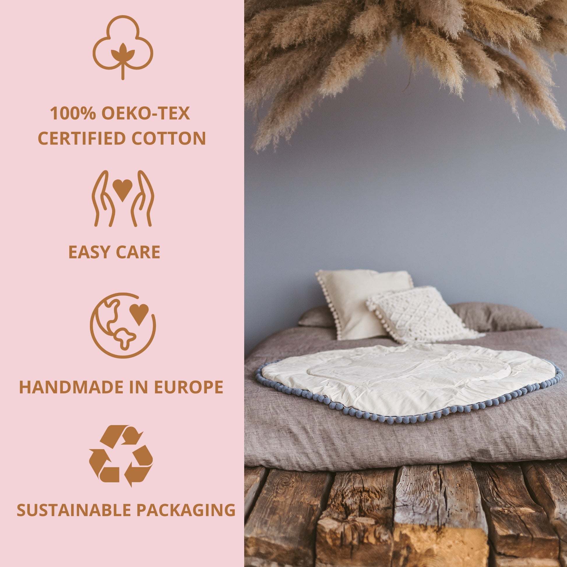 PREMIUM QUALITY TEXTILES. Our round play mats for kids with hypoallergenic 100% cotton, soft inside layer and gorgeous pom-poms trim are also perfect as kids' floor rugs, teepee playmats, or baby gym mats.