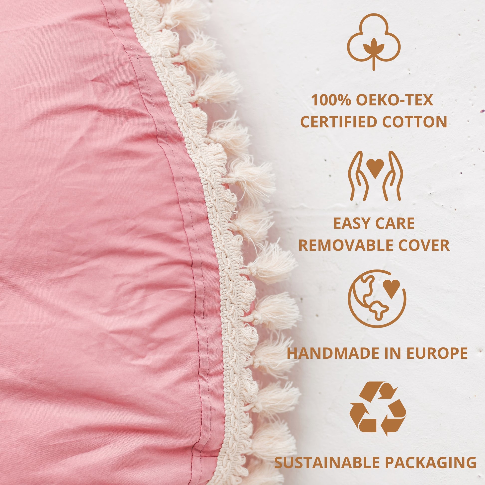 Oversized floor pillow is made from 100% cotton. OEKO-TEX standard allows you to put your trust in our products with the satisfaction that there are no allergens or insensitive material used, and your kids are safe.