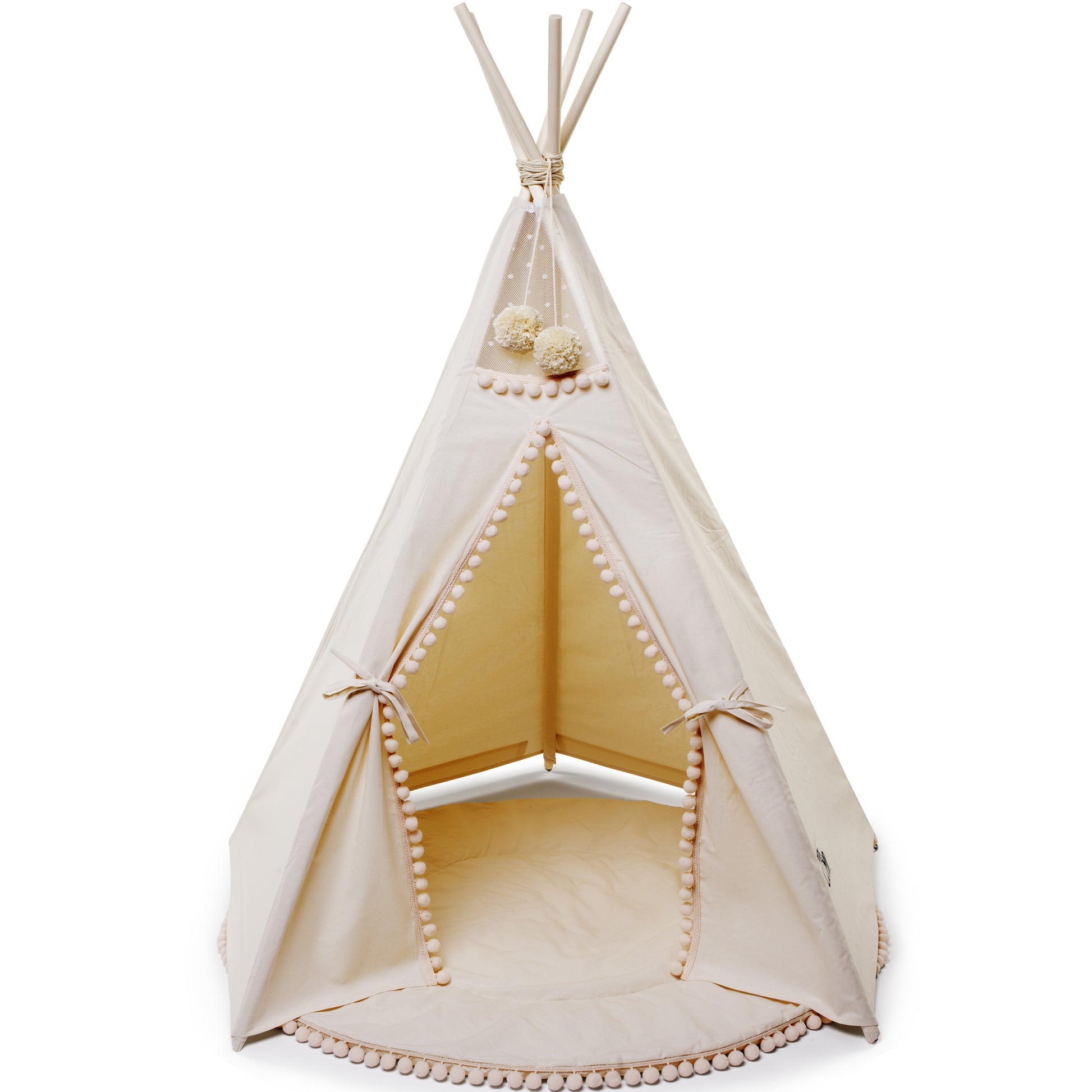 BEAUTIFUL DECOR. Tipi has a beautiful front door that is decorated with pompom decor. Two beige pompoms at the top are included.