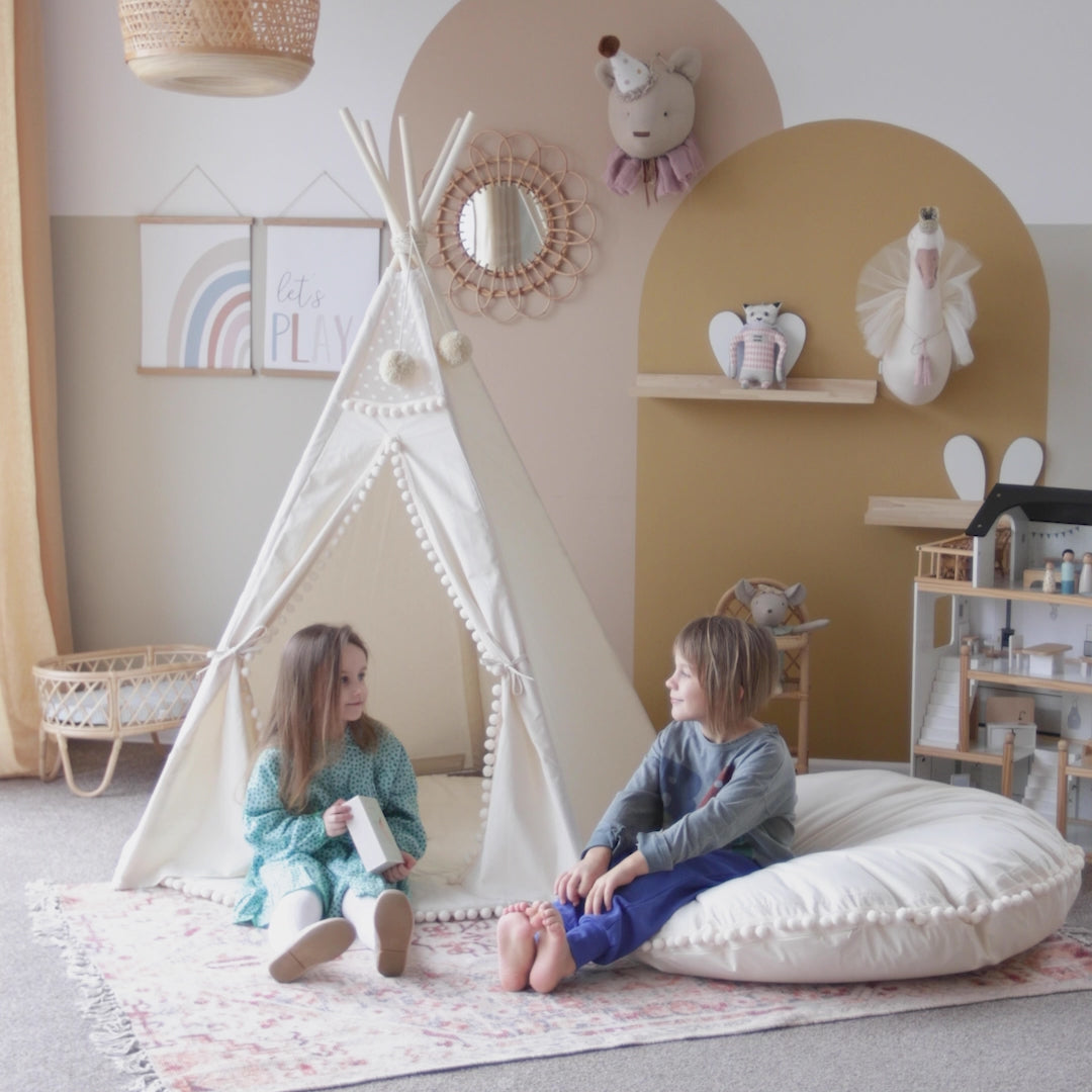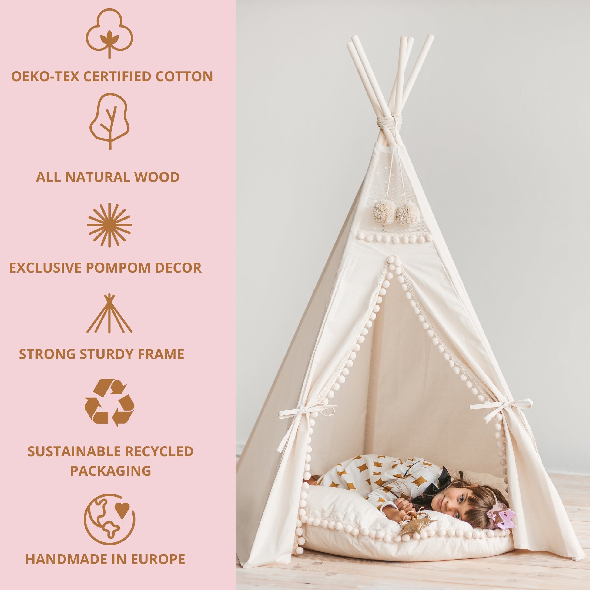 THE ORIGINAL DESIGN Kids teepee tent is handmade from natural OEKO-TEX cotton and wooden poles. Children love to have a little cave where they can hide and play, read books, or just relax. Experience whimsical playtime adventures with MINICAMP's Original Play Tent adorned with charming pompoms. Inspire imagination and create lasting memories.